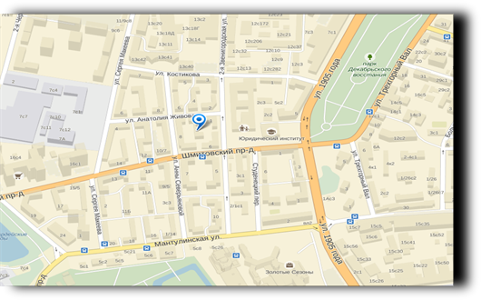Проезд на общественном транспорте: На троллейбусе №18 от метро «Улица 1905 года» 1.Троллейбус №18 до остановки: Улица Анны Северьяновой 2.Далее пешком до ул. Анатолия Живова Около 3 мин.